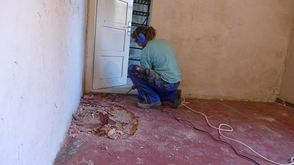 Eigentlich haben wir gehofft, das Esszimmer relativ schnell fertig zu bekommen. Die neuen Kabel sind ja schon verlegt und der Unterputz ist auch schon seit geraumer Zeit fertig. Aber es gibt bekanntlich immer neue Überraschungen. Da sich an einigen Stellen der Boden aufgewölbt hatte mussten wir der Sache mal auf den Grund gehen. Dabei hat Wolfgang herausgefunden das sich unter dem PVC Belag kein „normaler“ Zementestrich befindet, sondern ein sogenannter Steinholz- oder auch Magnesit-estrich. Wie der Name schon sagt ist ein Bestandteil Holz, feinste Sägespäne, und die mögen es gar nicht wenn es feucht ist. Da wir aber im Mauerwerk immer noch etwas aufsteigende Feuchtigkeit haben ist der Estrich an verschiedenen Stellen aufgebrochen. Ein Fachmann, den wir dazugeholt haben, meinte dann auch das wir den Estrich entfernen müssten und am besten auch die Wand abdichten, indem man viele kleine Löcher bohrt und dort ein trocknendes, verfestigendes Mittel injiziert. Also haben wir in einer Hauruckaktion den gesamten Estrich herausgemeißelt, bzw. Wolfgang hat gemeißelt und ich habe eimerweise den Schutt raus getragen. Danach wurden ganz viele Löcher gebohrt und das Mittelchen mit Hilfe von Trichtern in die Bohrlöcher eingebracht, dabei wurden wir tatkräftig von meinem Brüderchen unterstützt. Danach haben wir noch den Dachboden nach Schätzen durchkämmt aber leider bis jetzt nix gefunden, außer jeder Menge alter Dias, Fotos und haufenweise Staub 🙂